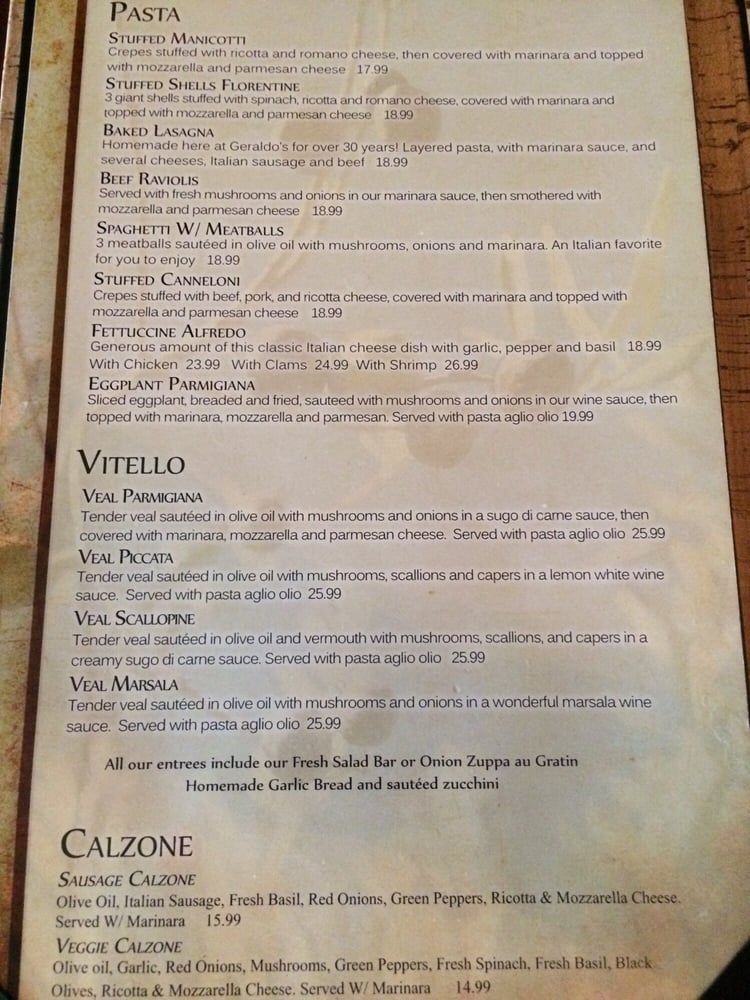 Homemade here at Geraldo's for over years! Layered pasta, with marinara sauce, and several cheeses, Italian sausage, and beef.