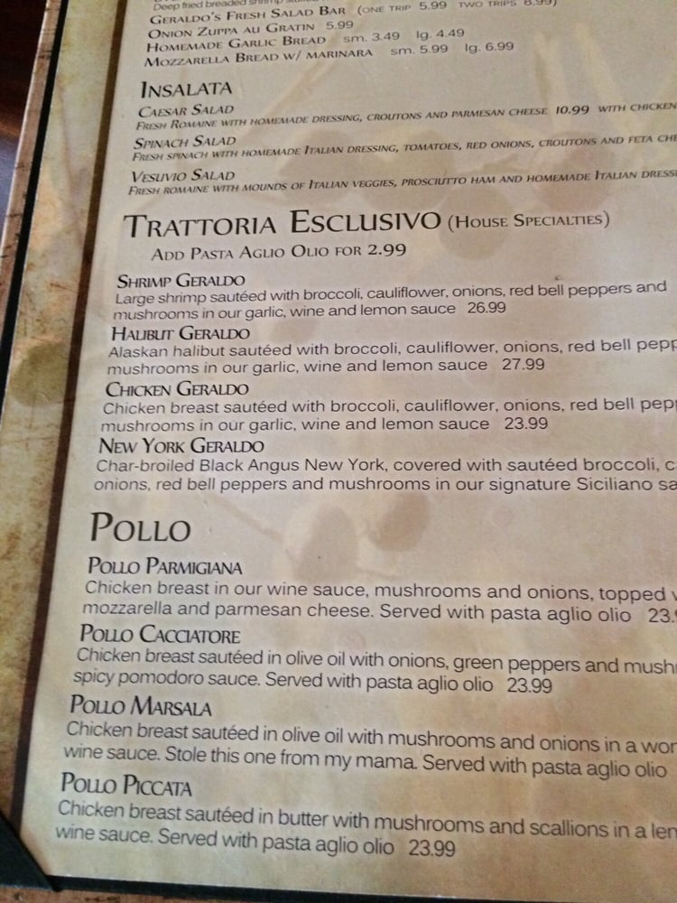 Tender veal sautéed in olive oil with mushrooms, fresh spinach, sage and prosciutto ham in our fabulous marsala wine sauce. Served with pasta aglio olio.